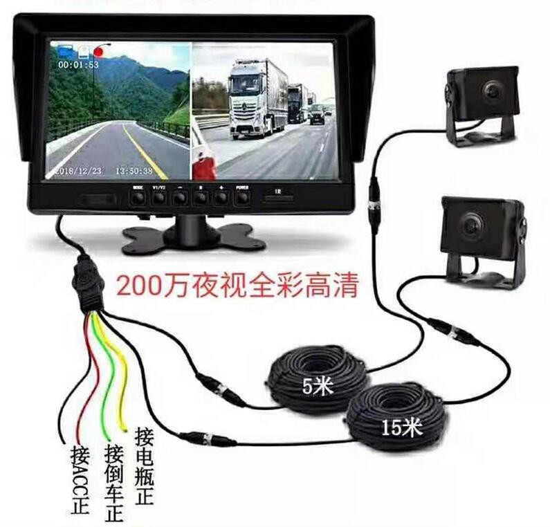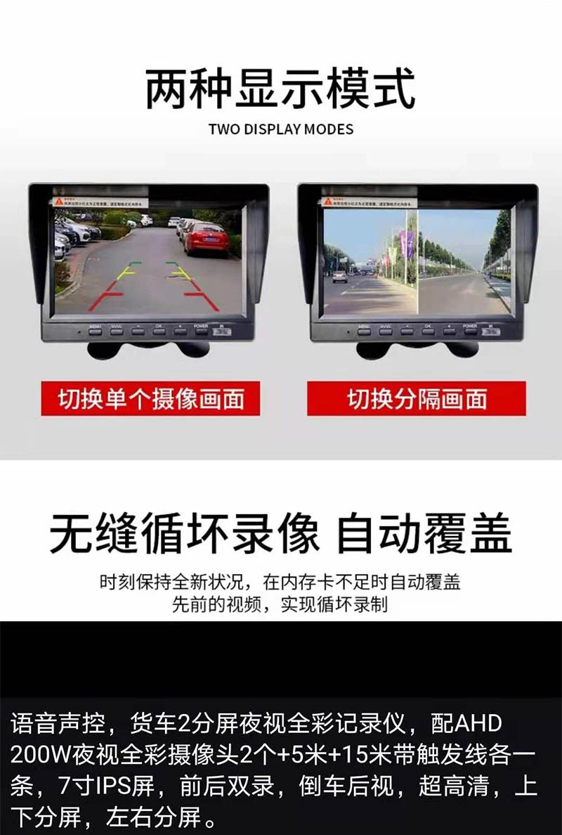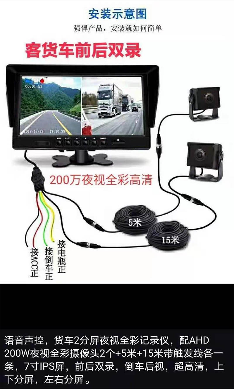 貨車2分屏夜視全彩記錄儀: 語音聲控,貨車2分屏夜視全彩記錄儀, 配AHD 200W夜視全彩攝像頭2個(gè)+5米+15米帶觸發(fā)線各一條,7寸IPS屏,前后雙錄,倒車后視,高清,上下分屏,左右分屏。