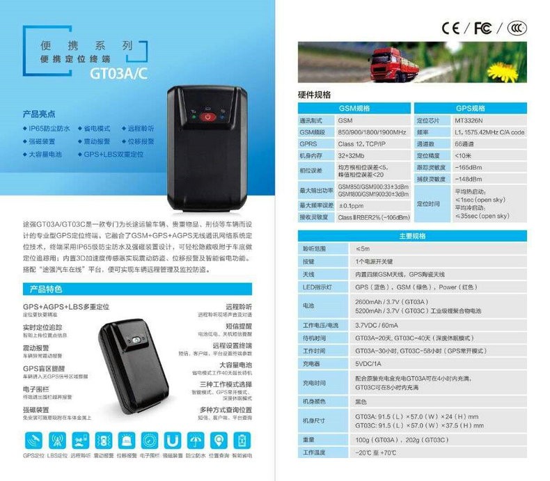 途強(qiáng)GT03A/GT03C是一款專門為長途運(yùn)輸車輛、貴重物品、刑偵等車輛而設(shè)計(jì)的專業(yè)型GPS定位終端。它融合了GSM+GPS+ AGPS無線通訊網(wǎng)絡(luò)系統(tǒng)定位技術(shù),終端采用IP65級防塵防水及強(qiáng)磁裝置設(shè)計(jì),可輕松隱藏吸附于車底做定位追蹤用:內(nèi)置3D加速度傳感器實(shí)現(xiàn)震動防盜、位移報警及智能省電功能。